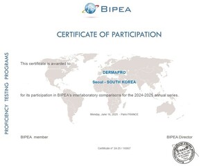 한국금융경제신문=김영권 기자 | 피부과학 전문 시험기관 ㈜더마프로(DERMAPRO)가 프랑스의 국제 비교숙련도 시험기관 BIPEA(Bureau Interprofessionnel d’Études Analytiques)가 주관한 “2024-2025년 자외선차단제 국제비교숙련도시험(Program 60: Sunscreen Products, in vivo SPF)”에 참여해, ‘Satisfactory(만족)’ 판정을 받고 공식 인증서를 획득했다고 27일 밝혔다. 이는 자외선차단제 효능 평가 항목에서 BIPEA 인증을 받은 사례로, 국제 시험